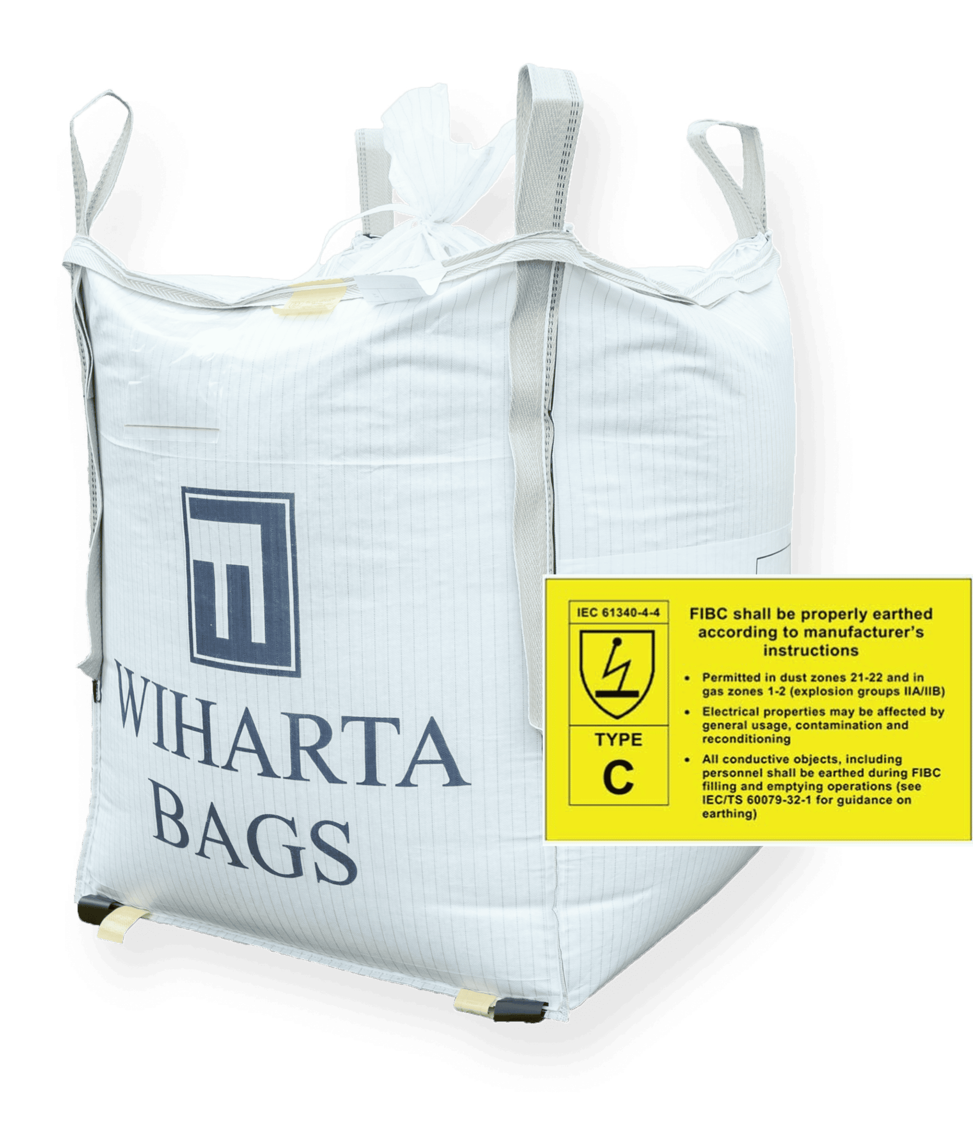 Type C bags are also known as Conductive FIBCs and are produced from fabrics with conductive fibres or tapes. Conductive FIBCs can be used to transport and store flammable powder products and are safe to use even when flammable gases and vapours are present in the environment, as long as the bag is grounded during filling and unloading the products. The voltage rating of the conductive fibres on the bag must be in contact with less than 107-6 ohms of resistance to the ground.